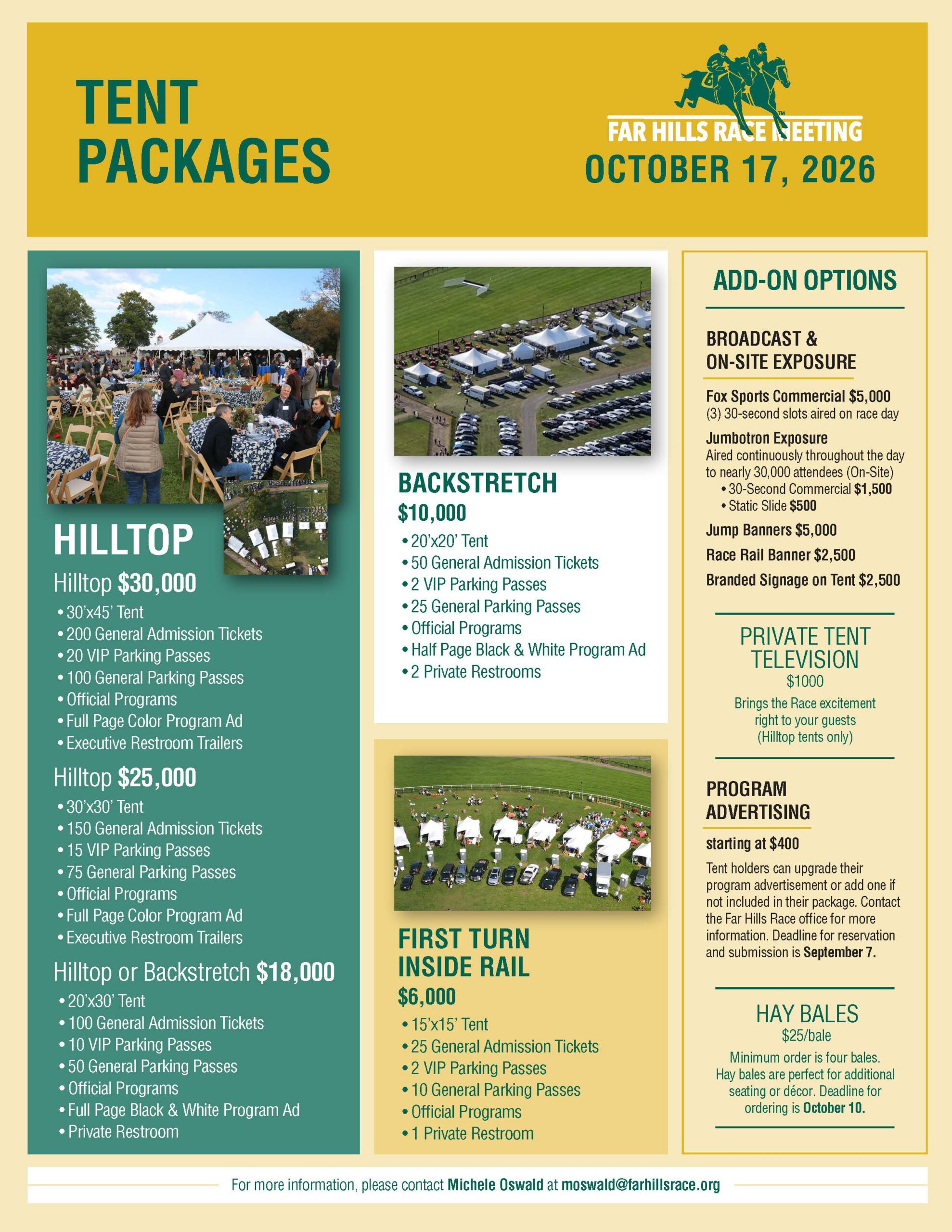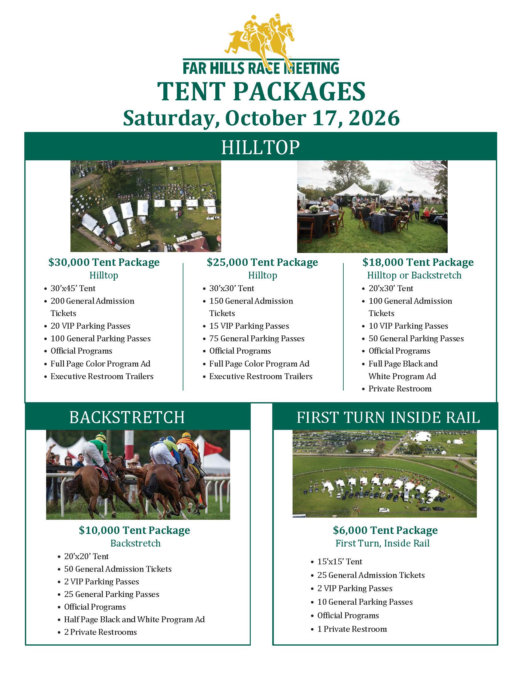 Far Hills Race Meeting offers a wide range of tent packages, each tailored to your specific needs. All packages include excellent viewing, private tent, general admission tickets, parking passes, event programs, and private restroom access.